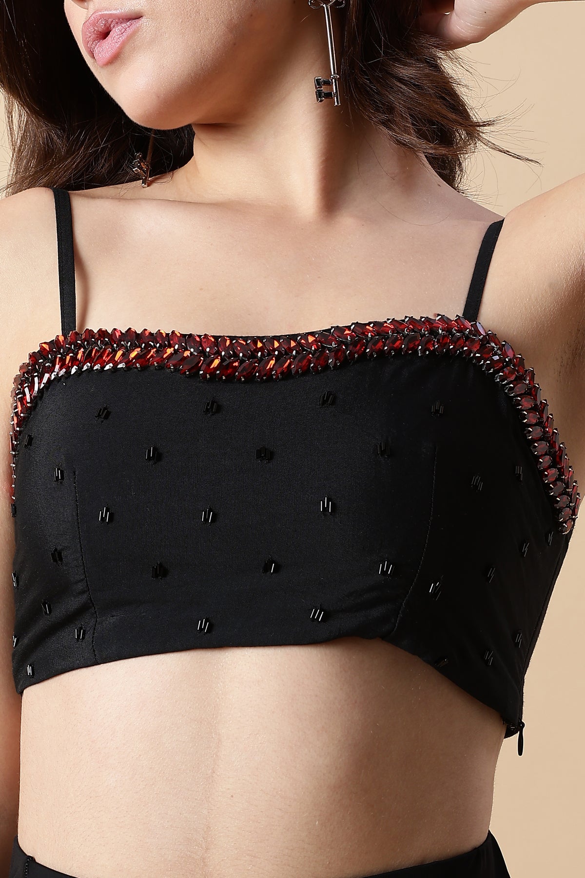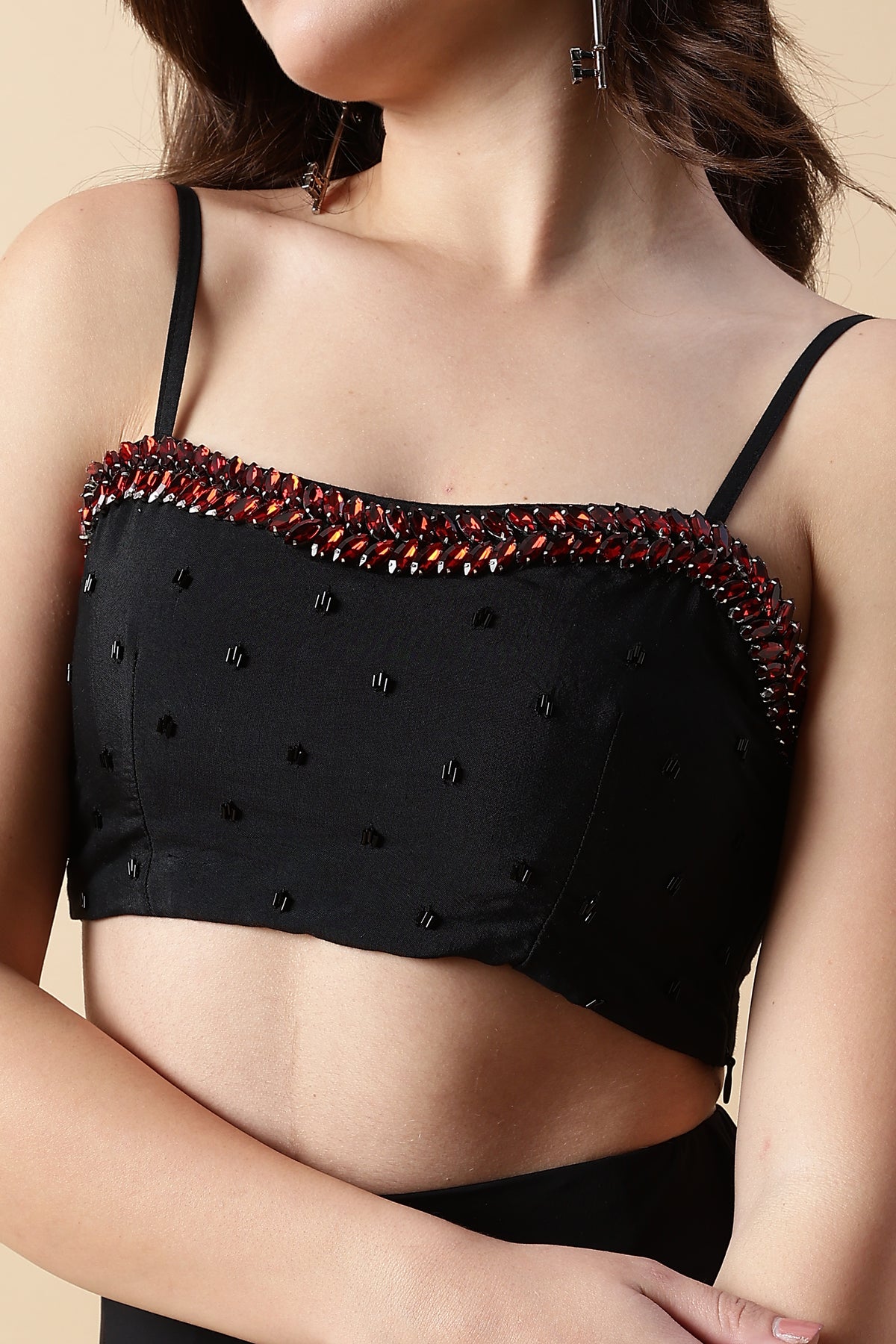 Midnight Ember is crafted for the woman who moves like a quiet spark in the dark. The cropped bustier features exquisite hand embroidery — crystals and glass beads that glimmer like glowing embers against a velvety night sky. The neckline is sculpted with a striking gradient embellishment, drawing attention with every turn.